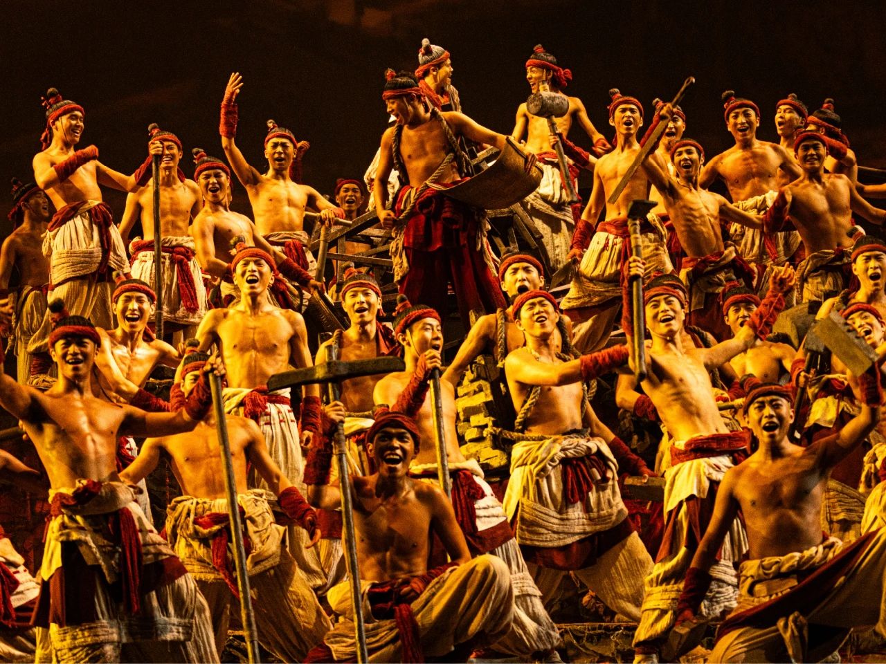 这场演出最让我惊艳的,当属那真刀真枪的战场戏。舞台上,秦军将士们手持利刃,奋勇拼杀,金属碰撞的声音清脆响亮,每一下都仿佛敲在我的心上。他们的动作刚劲有力,眼神中透露出坚定与无畏,让人真切地感受到了战争的残酷与激烈。那纷飞的战火、弥漫的硝烟,配合着逼真的音效和震撼的灯光,仿佛将我瞬间拉回了那个金戈铁马的大秦时代。比起电影特效营造出的战争场面,这里的现场表演更加真实、更加热血,让人看得肾上腺素飙升,全程都忍不住尖叫!