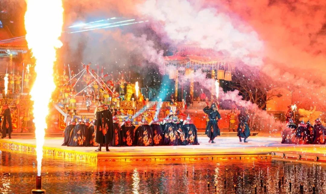 震撼的视觉呈现:以华清宫的骊山为背景、九龙湖为舞台,利用真山真水打造立体实景舞台。运用先进的灯光、音响、舞美效果,营造出万星闪烁的梦幻天空、森林雾瀑、湖面火海等震撼场景。