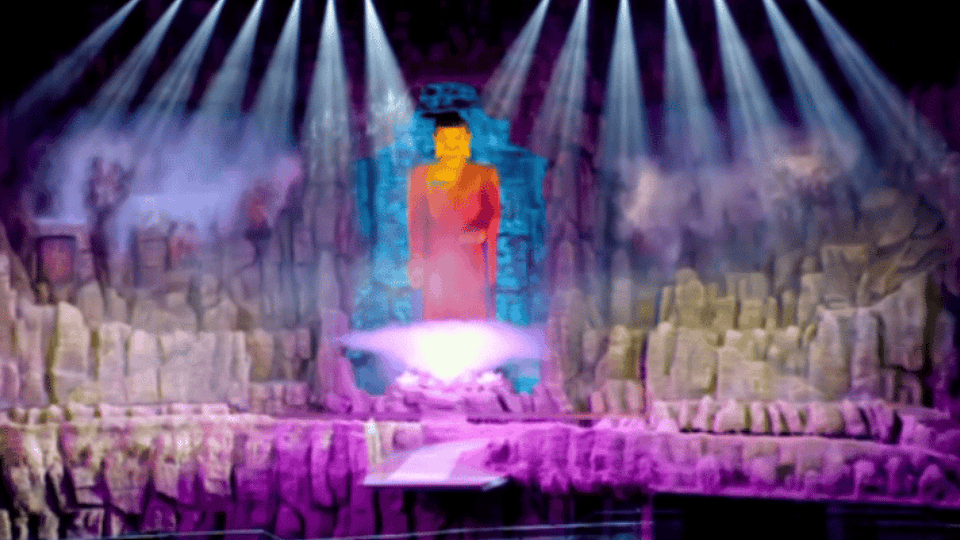 亮点:首创 360° 旋转观众席!跟着驼队穿越雪山、沙漠,20 头真骆驼、30 匹 “苍狼” 同台飙戏。千吨 “圣水” 从天而降,巴米扬大佛缓缓升起,每一秒都是好莱坞大片既视感,体验丝路驼队的热血与悲壮。