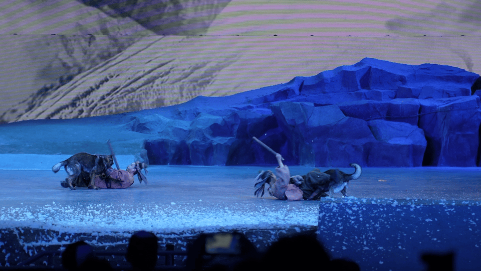 走进剧场,你就会被震撼到!舞台上,20 头骆驼组成的商队真实还原了当年丝绸之路的景象,驼铃声声,仿佛穿越千年而来。还有 30 只经过驯化的西北狼登台表演,它们狂奔、嘶吼,场面十分惊险。真的是第一次在舞台上看到这么多真动物,这种近距离接触的体验,可比看纪录片带感多了。除了动物,舞台上还有火山喷发、雪崩、千吨圣水扑面而来等场景,配合逼真的音效和灯光,感觉就像自己也跟着驼队踏上了那条充满未知与挑战的丝绸之路。